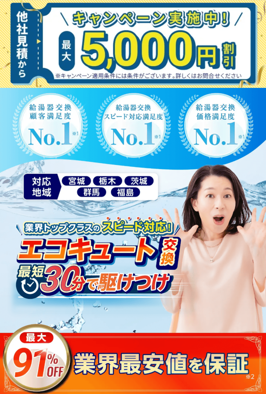 最短30分で駆けつけ可能。自社スタッフによる即日対応で、急なお湯のトラブルにもスピーディーに対応できると圧倒的な早さが評判です。