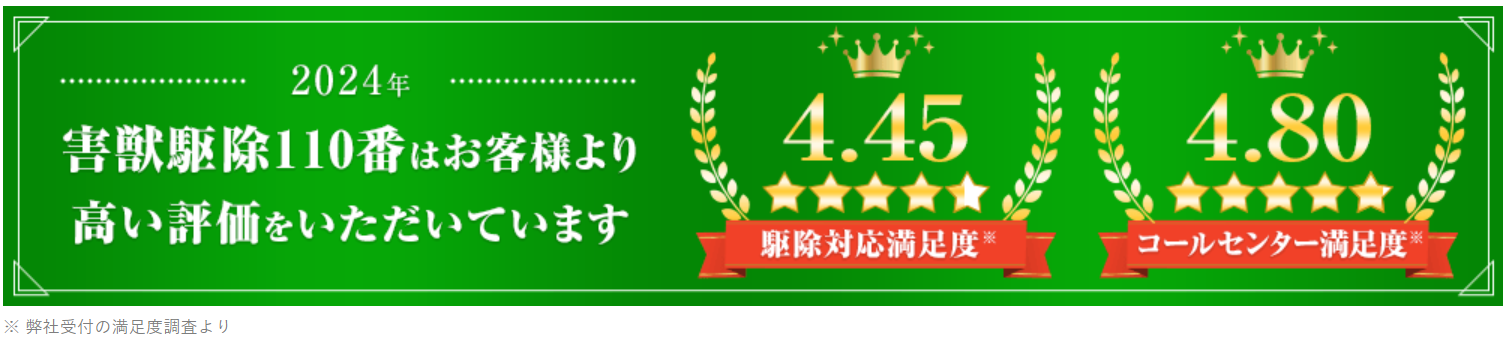 害獣駆除110番は、害獣駆除評価において「顧客満足度」「解決スピード」「価格満足度」「ご利用シェア」の4部門で高評価を獲得!これまで利用した方から多くの支持を集めています。
